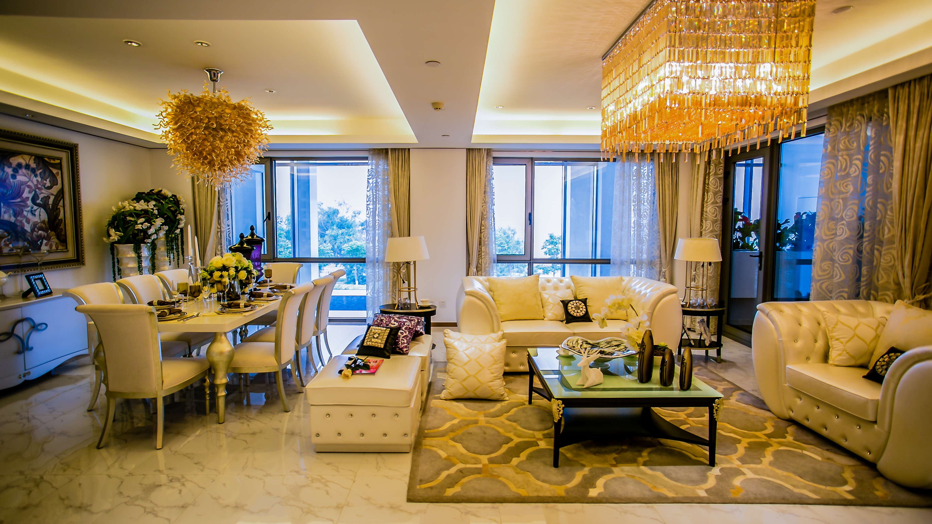 沒有過多的裝飾,圓桌圓椅和多層圓形水晶吊燈相互輝映,呼應“天圓地方”的說法,體現業主天人合一的態思想度。落地百葉窗使整個環境更加寬敞明亮。餐桌與餐廳吊燈及墻上的裝飾畫相呼應,干枝花瓶的擺放充分體現中國傳統美學精神,注重細節的設計往往更能體現空間的品質,在住宅空間中同樣能達到“移步換景”的裝飾效果。