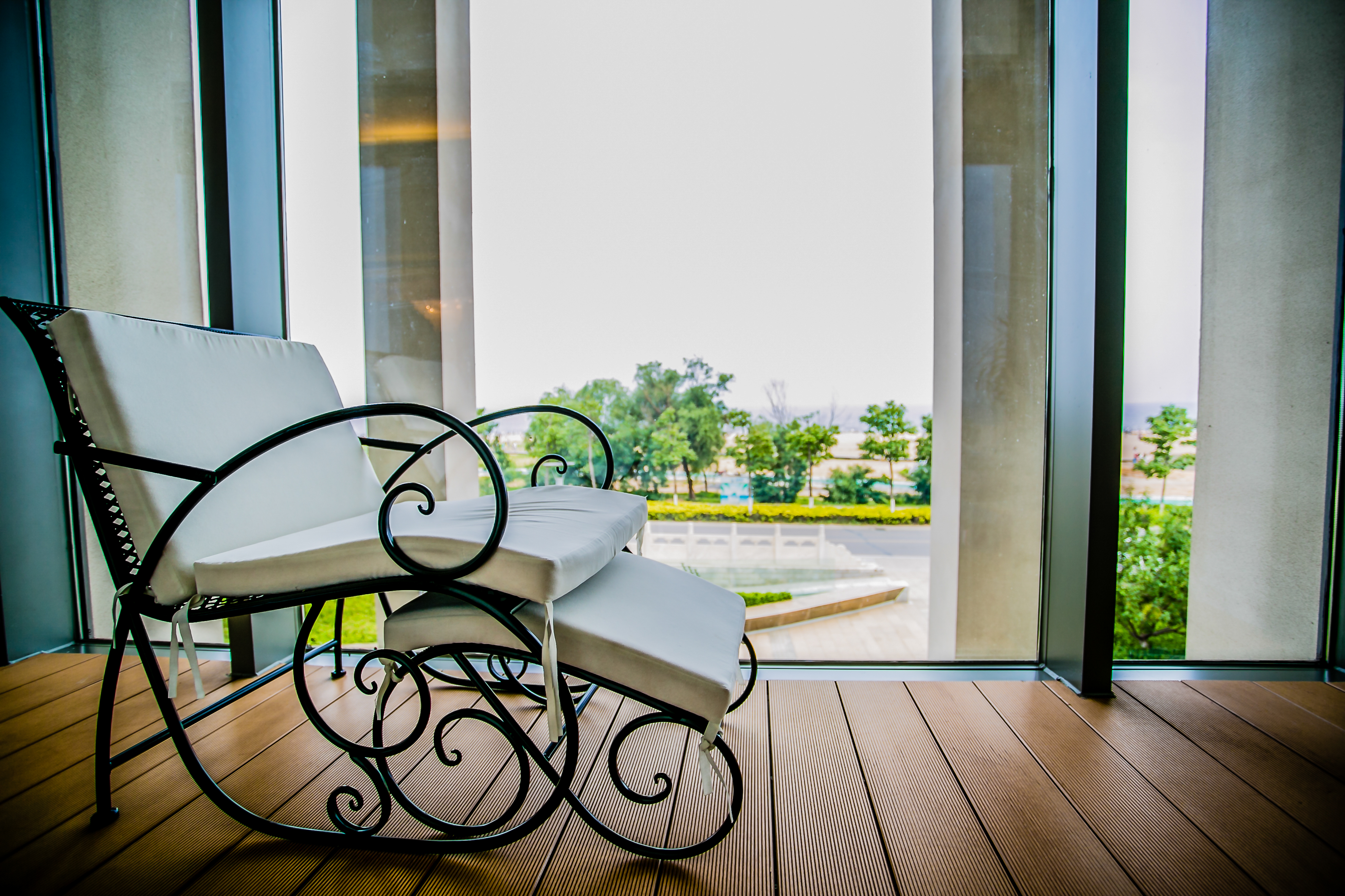 臥室的裝修更偏向新中式風格,靛青色的絨地毯,題詞山水背景墻,床頭柜的設計都充滿中式元素。實木復合地板樸實耐用,陽光透過紗簾,為房間鋪上一層柔軟的光暈。木質飾面板更加烘托了舒適溫馨的空間氛圍,而背景墻上的裝飾品卻使得整個空間在深沉含蓄的氛圍中增添了些許清新。