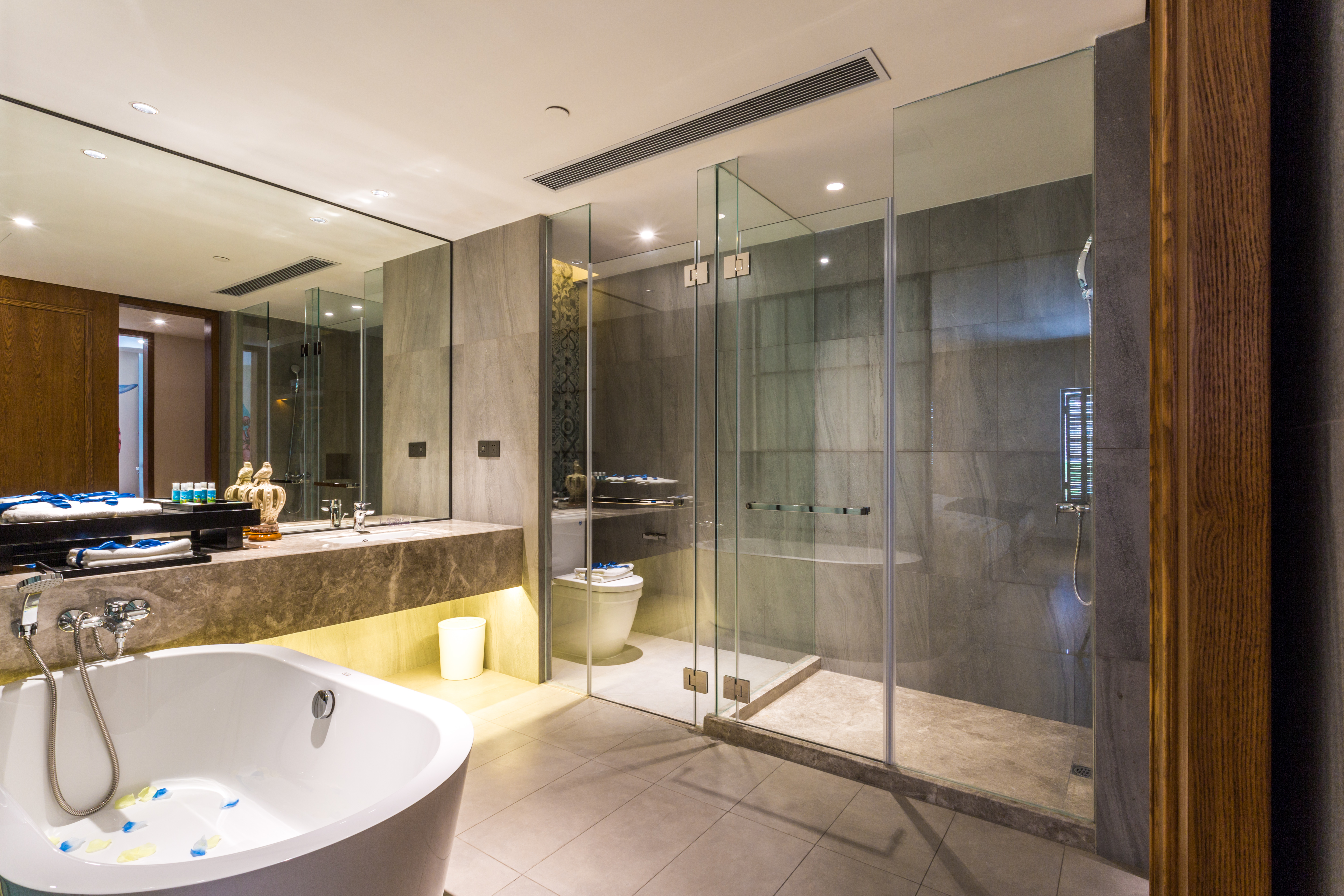 棕色臺面與大理石和棕色木質組合形成的置物柜,配上一面方鏡,打造出充滿質感的洗漱區,換洗衣物掛放區采用棕色木板、木丁組合,讓整個畫面更顯質感。浴室光線自然,空氣通透,白色天花板和地板,與置物柜相呼應,讓空間搭配更有融合性。