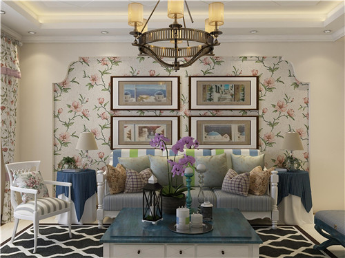 在這張客廳效果圖中,整體看起來非常雅致大方,處處體現著簡歐田園風光的味道。客廳中深藍色的柔軟沙發,搭配深藍色碎花的電視背景墻再合適不過。客廳地面采用的也是藍色花卉圖案的地毯,既顯得高貴又復古。
